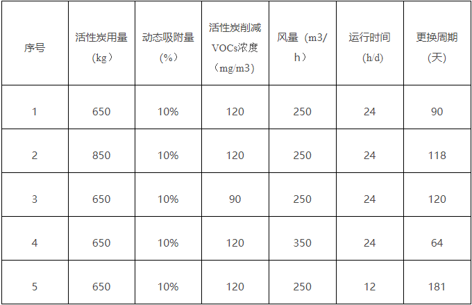 計(jì)算示例:下表中,后四組分別對第一組數(shù)據(jù)的活性炭用量、活性炭削減VOCs濃度、風(fēng)量、運(yùn)行時(shí)間進(jìn)行改變,得出不同的更換周期。